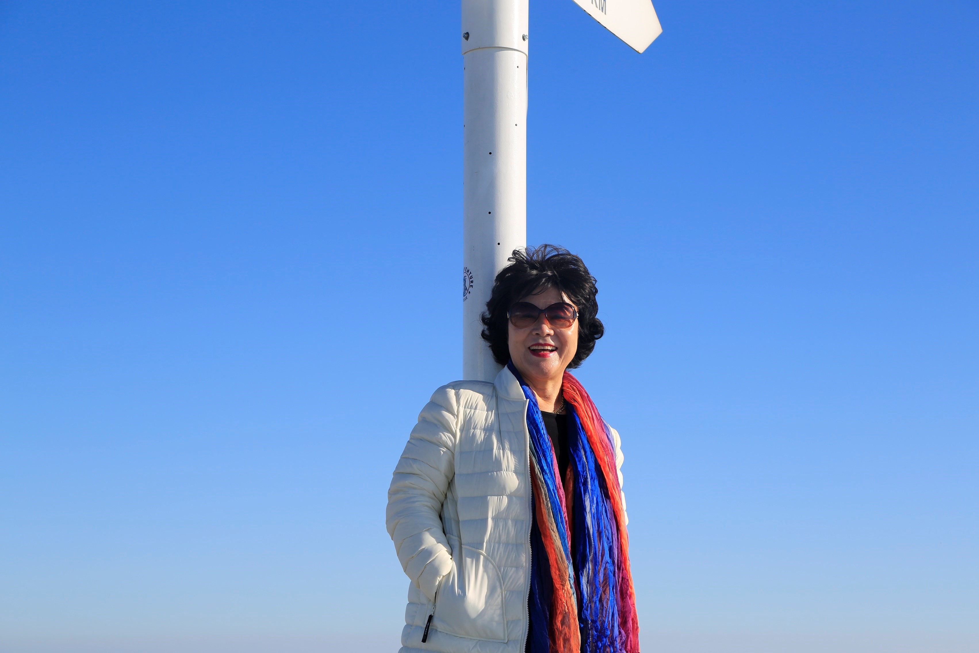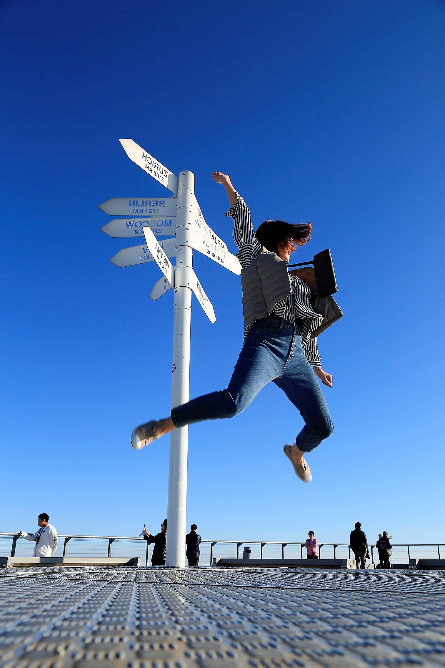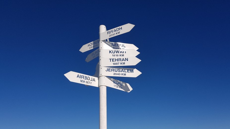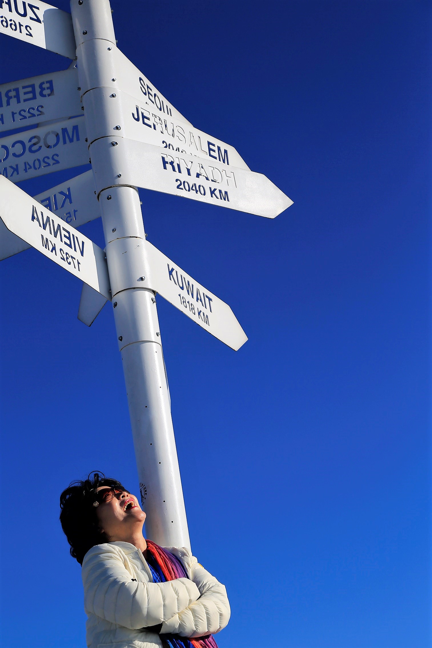 산상카페의 옥상에 오르니 각국 도시의 거리와 방향을 알리는 표지판이 있다.