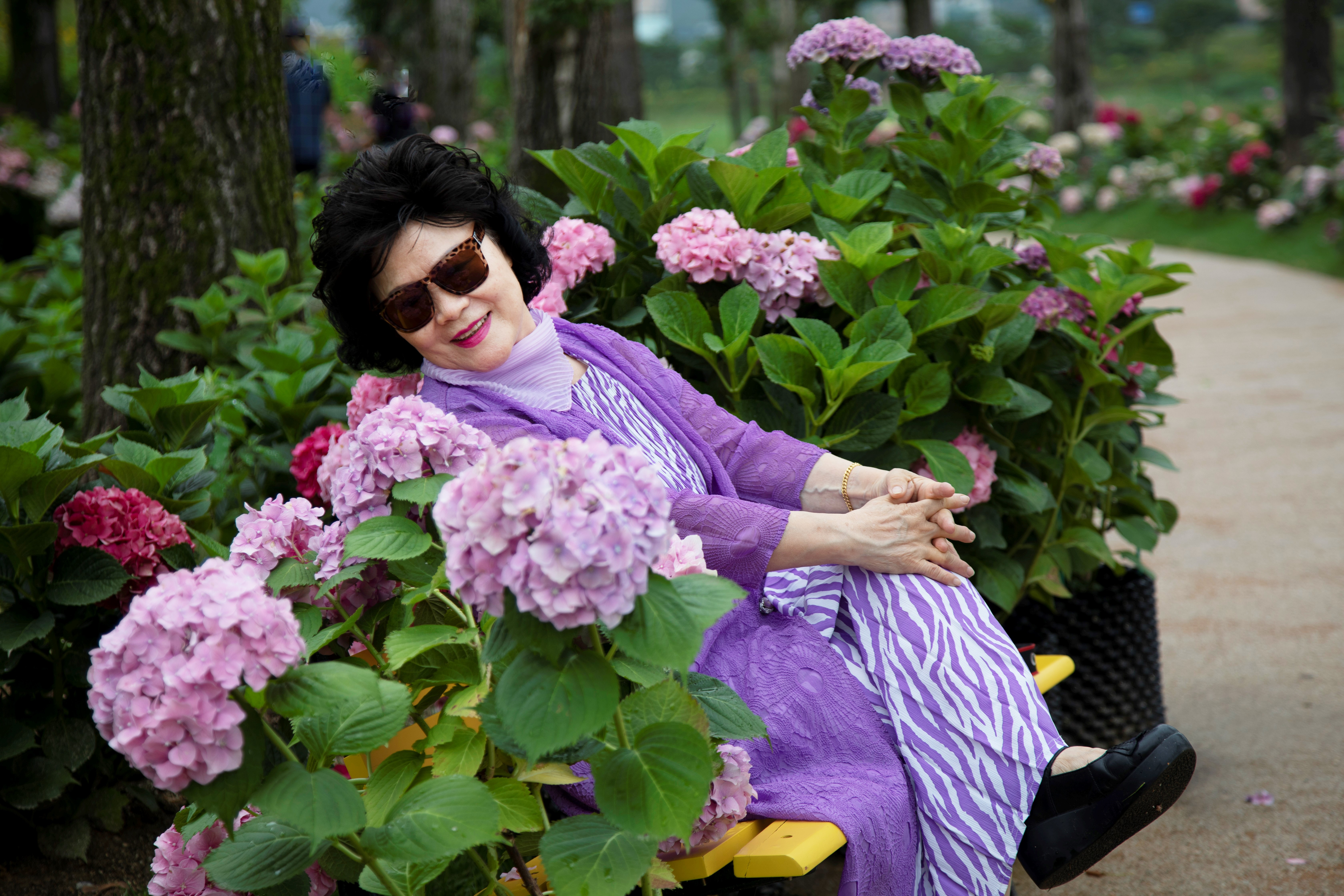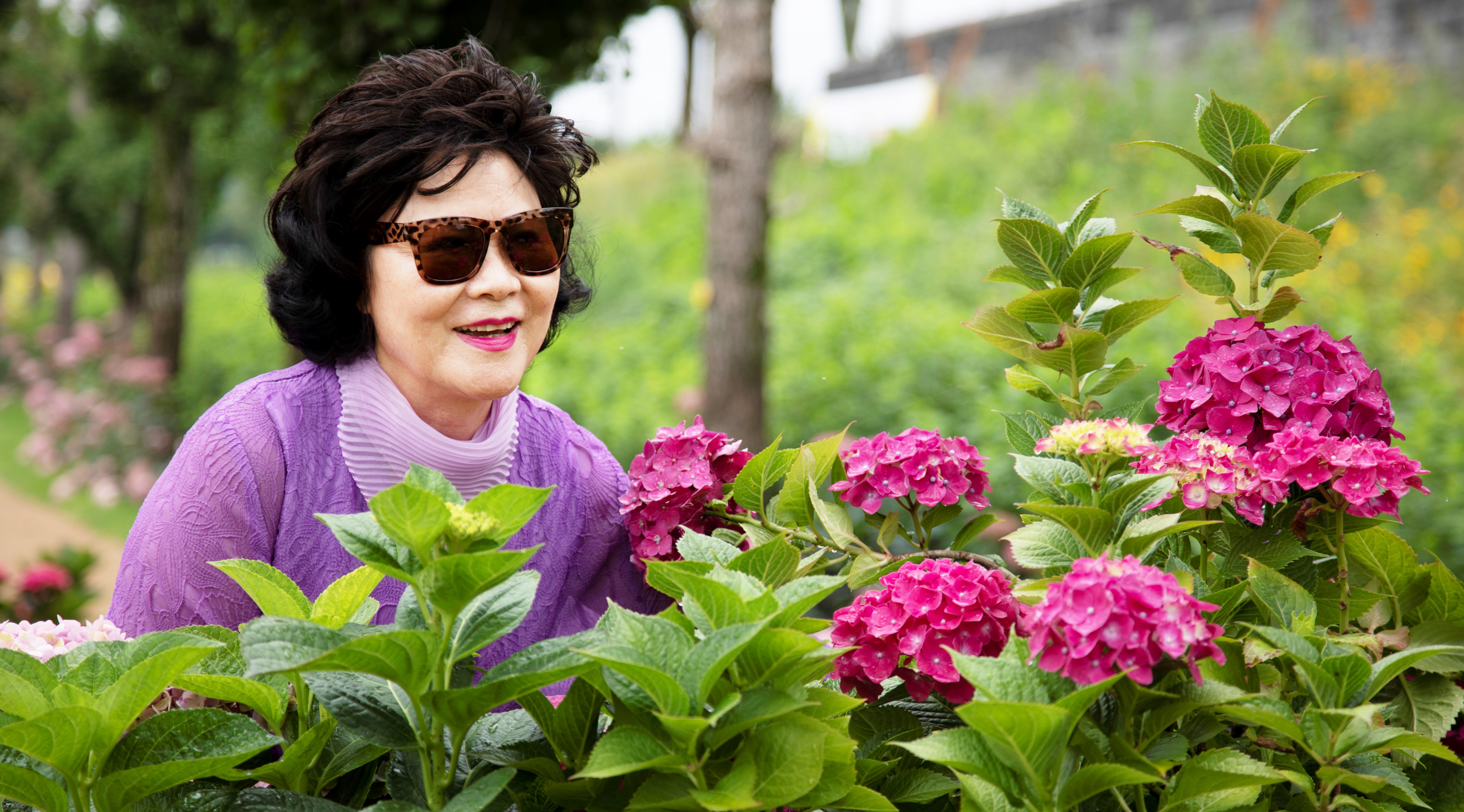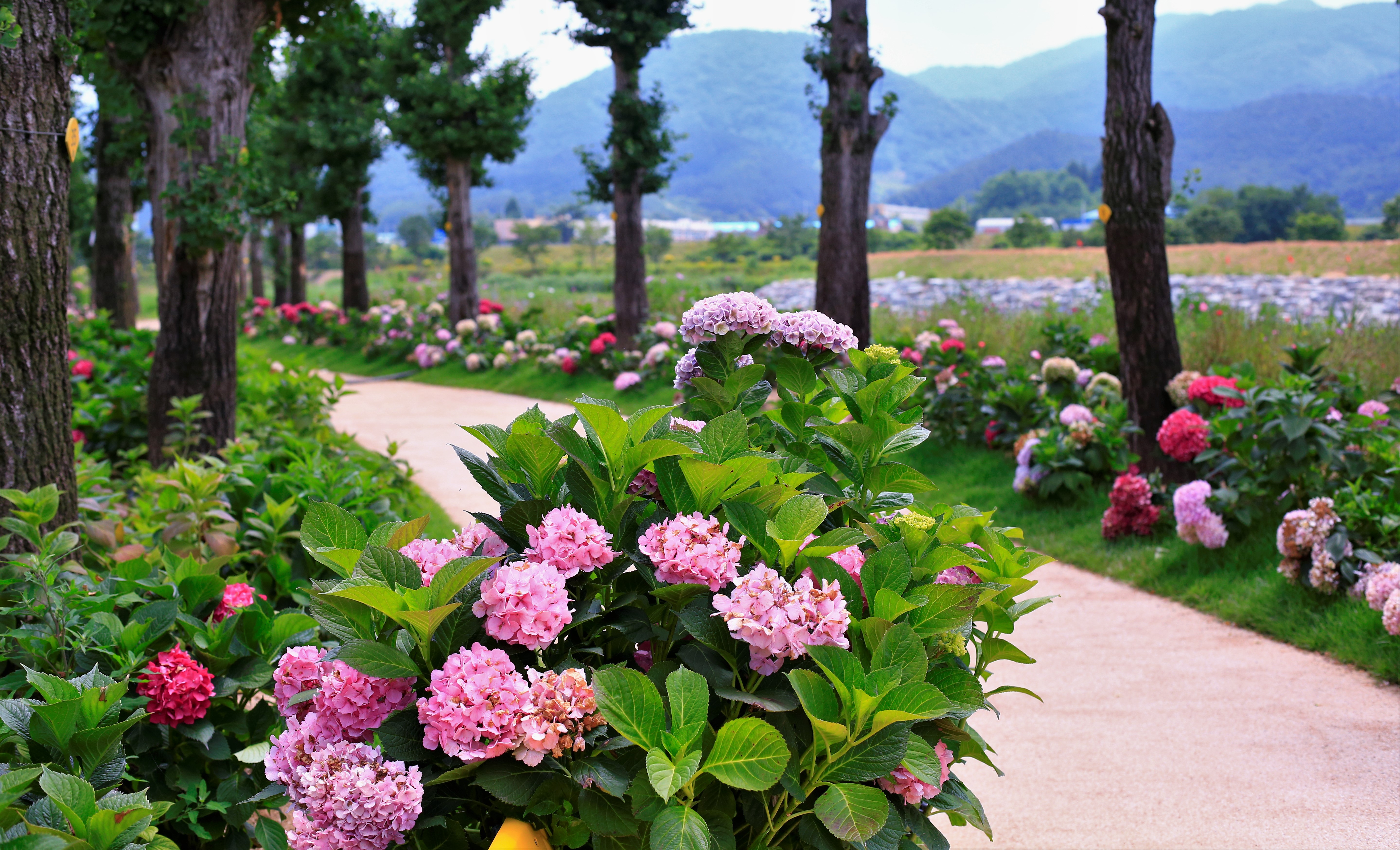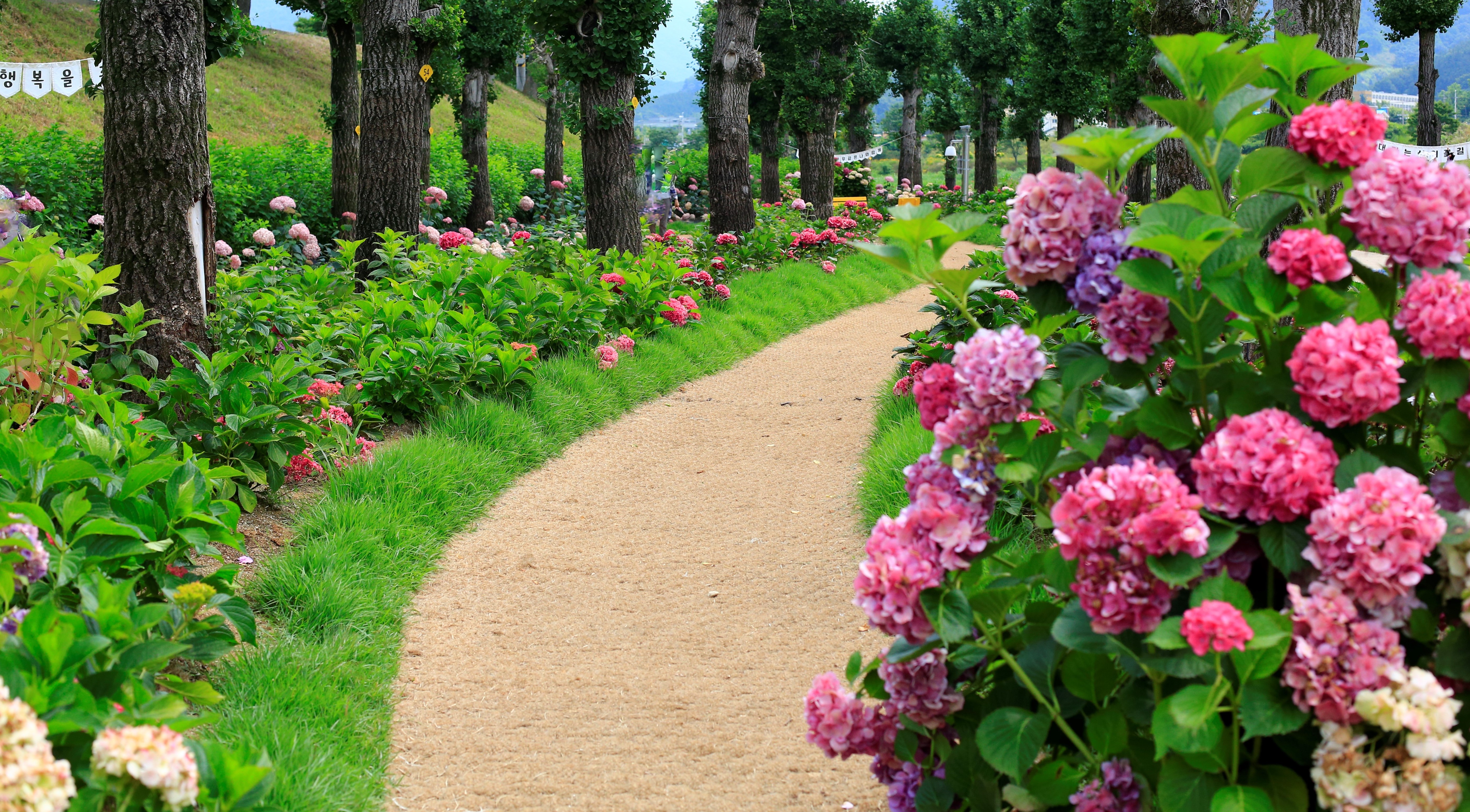 수국이 가득한 꽃밭에서