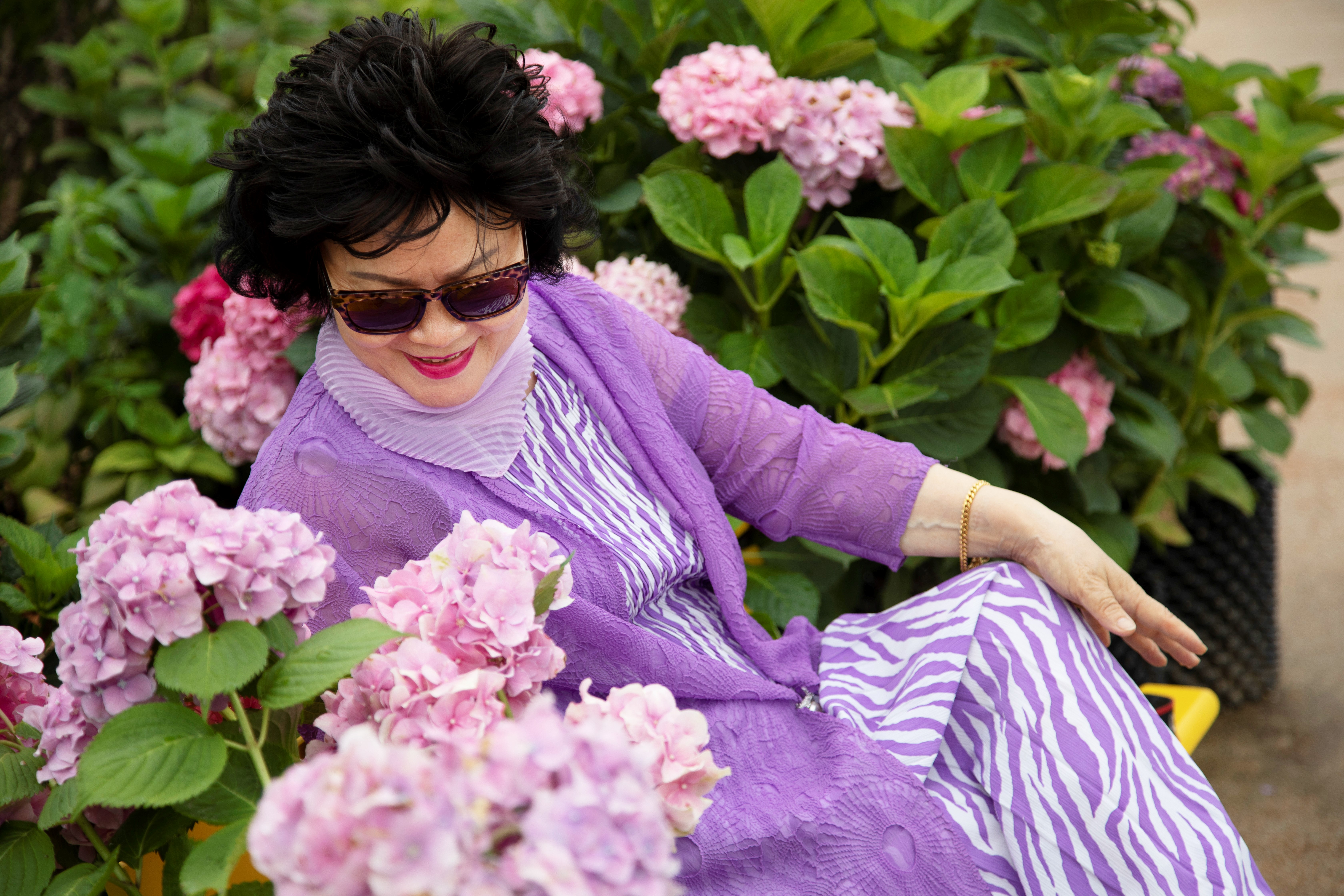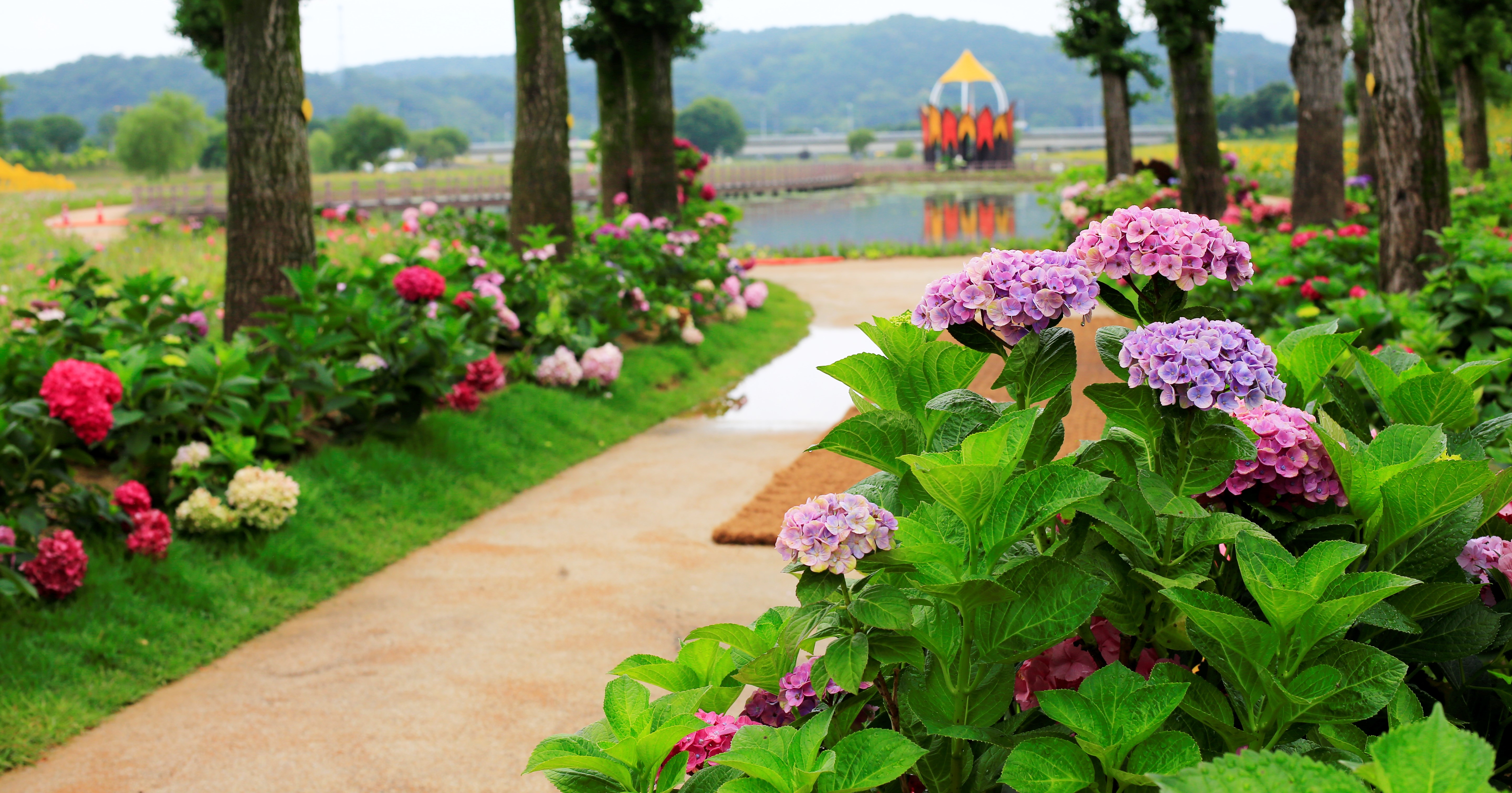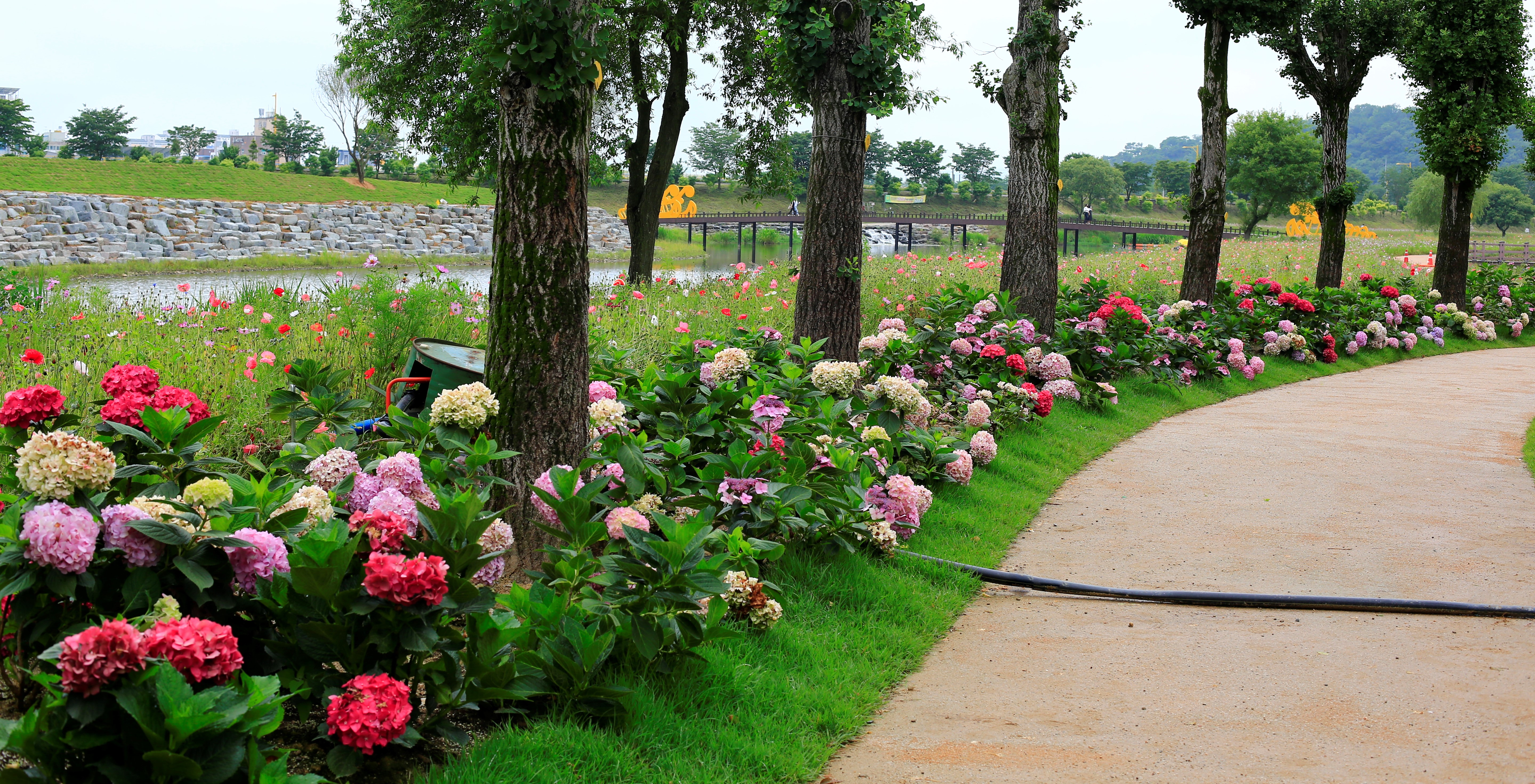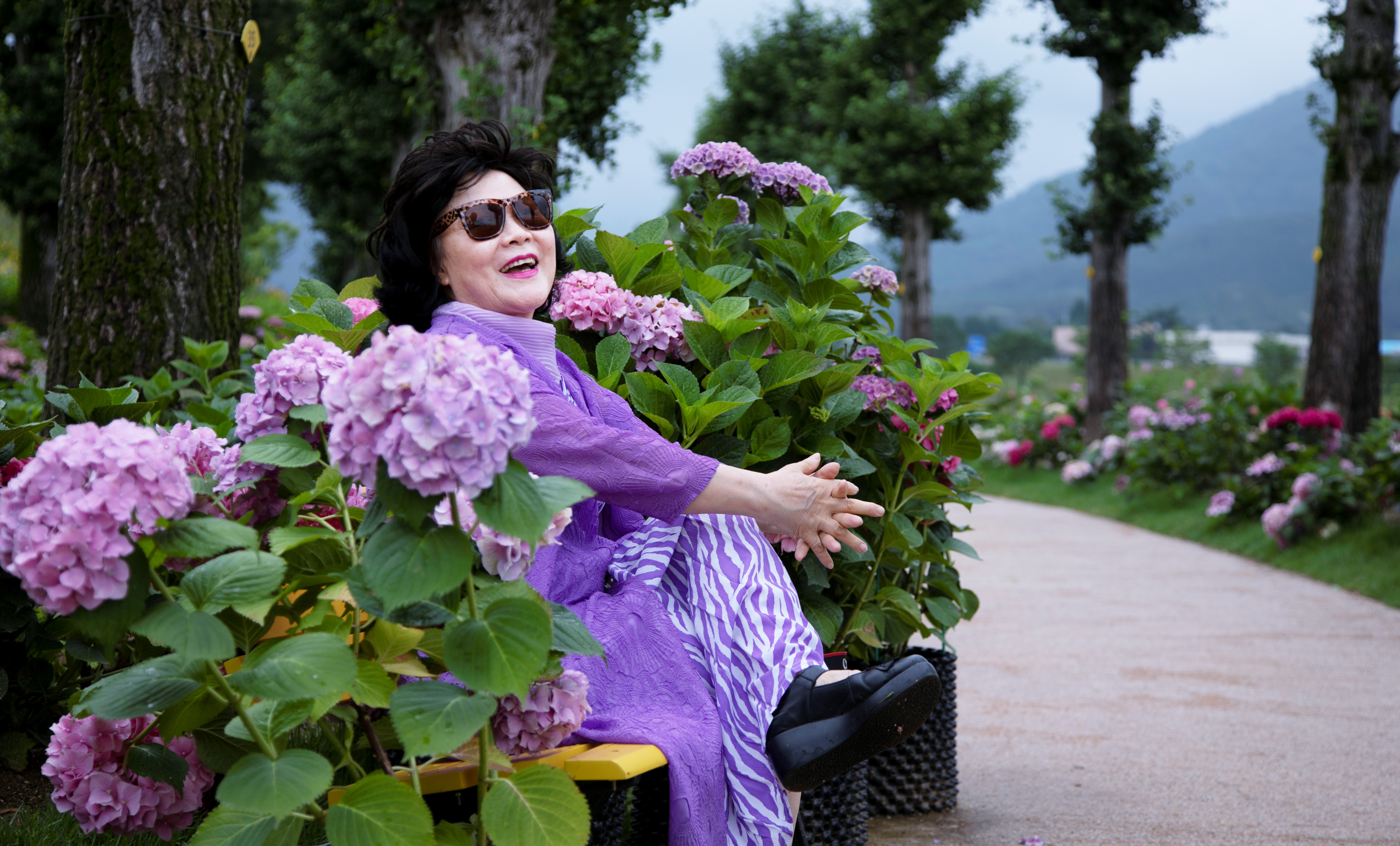 수국이 가득한 꽃밭에서